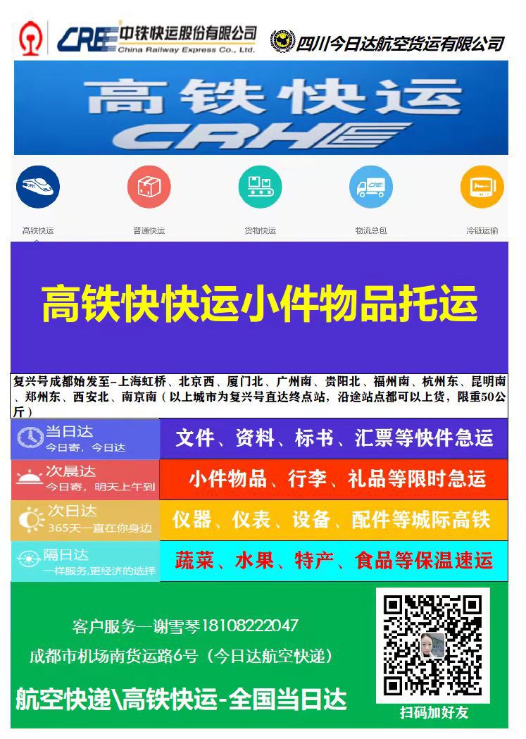 即日起四川航空货运有限公司已开通高铁快运渠道,货物单件不超过50kg,了解详情请咨询谢雪琴18108222047